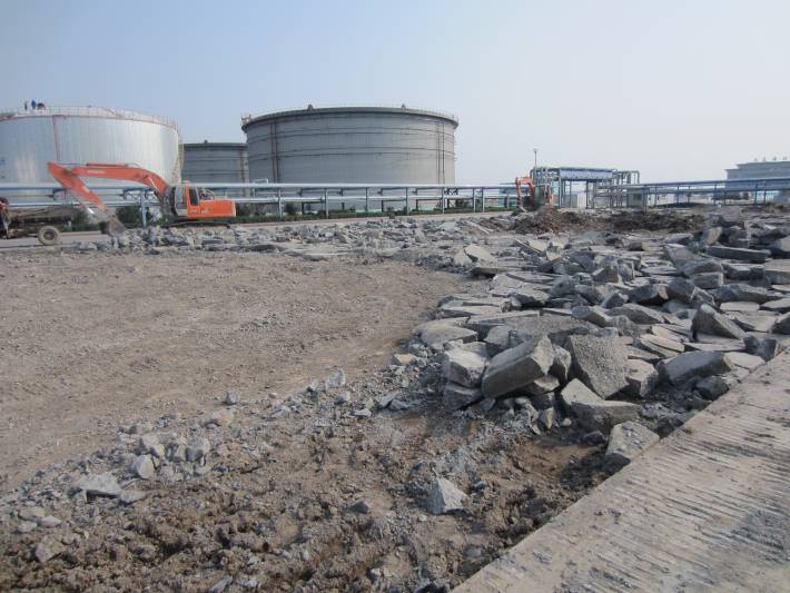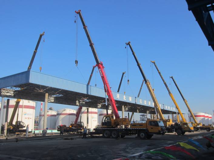 吊裝作業(yè)現(xiàn)場(chǎng) 破道碎石為儲(chǔ)罐打地基