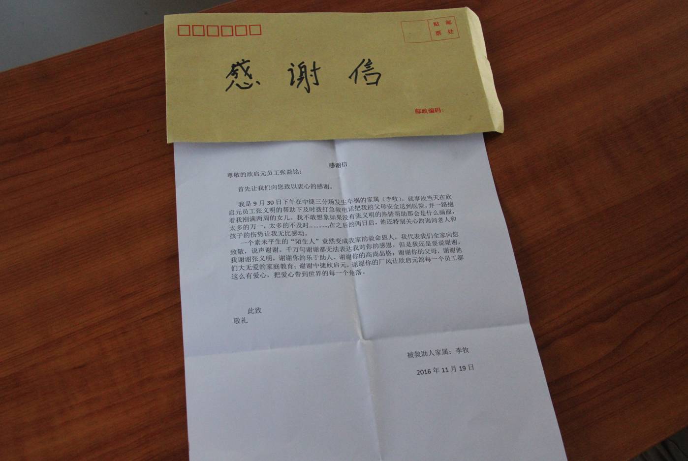 救護(hù)車到來后,張益銘與醫(yī)護(hù)人員將兩位老人和孩子抬上車趕往醫(yī)院。到醫(yī)院后,他推著兩位老人做各項檢查,并墊付醫(yī)藥費(fèi),一直等到家屬的到來。由于下午還需要上班,和交警、家屬介紹完事故過程及大概受傷情況后他離開了醫(yī)院,事后沒和任何人提起,直到被救人員家屬送來錦旗和感謝信的那一刻。張益銘說:“在救人過程中沒耽誤時間是我最欣慰的”。