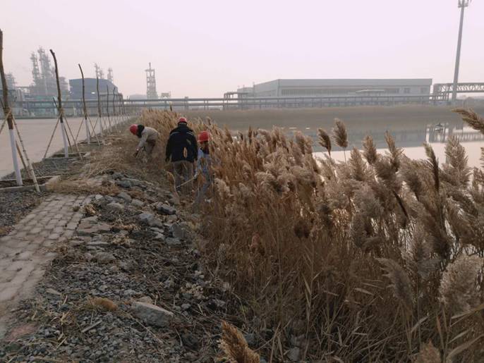 細問之下了解到,原來是運行六部的尾氣硫酸銨二班、水廠二班、污水二班的員工們看到景觀湖周圍干枯的蘆葦影響了公司整體環(huán)境的美觀,同時面臨氣候干燥的冬季容易成為火災(zāi)隱患。為此,班長們主動溝通交流,利用休班時間自動自發(fā)的對景觀湖蘆葦進行清理。