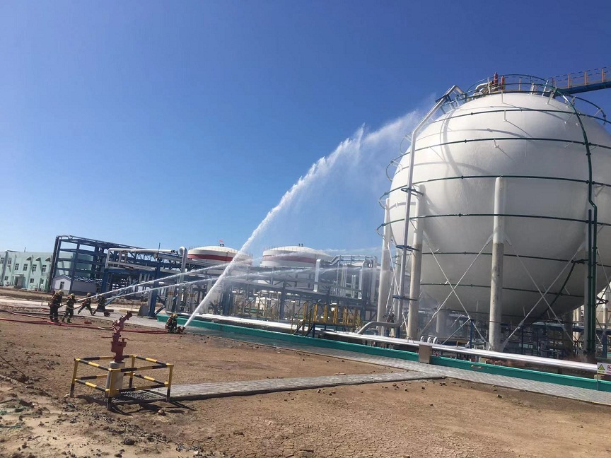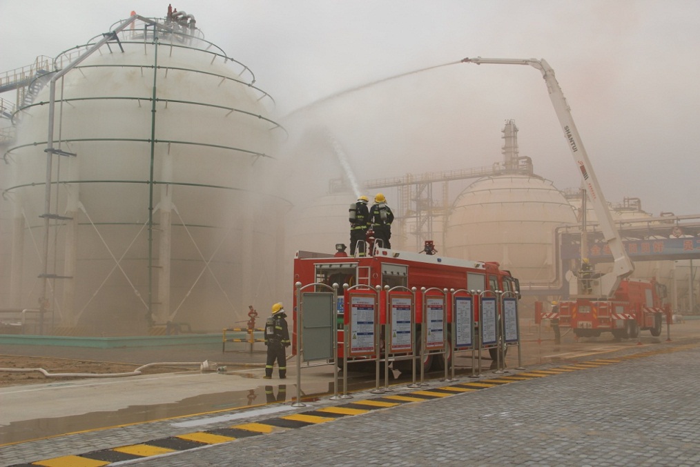 本次演練模擬丙烯球罐根部法蘭泄漏著火,通過采取現(xiàn)場(chǎng)消防應(yīng)急措施進(jìn)行自救無法控制,請(qǐng)求政府支援。經(jīng)過現(xiàn)場(chǎng)緊急處置及企業(yè)消防隊(duì)、政府有關(guān)單位的支援,成功將火勢(shì)控制。
