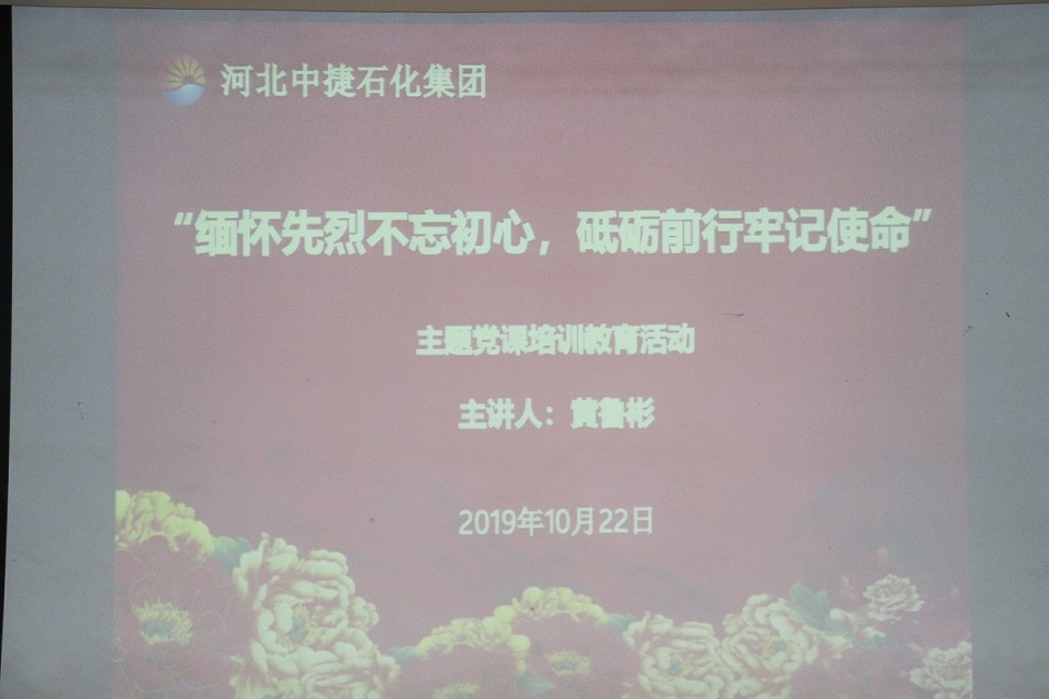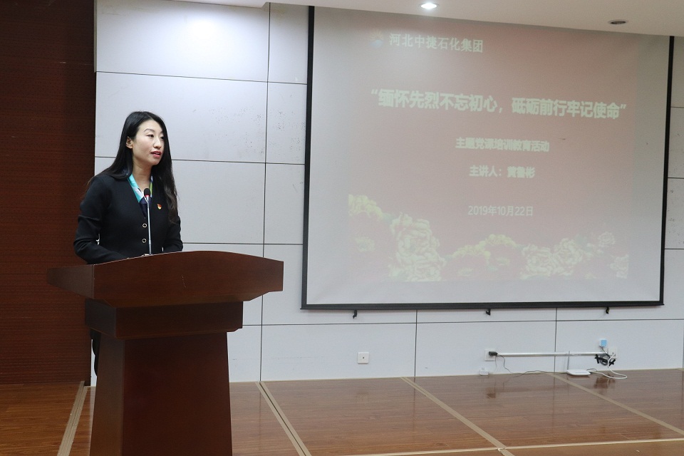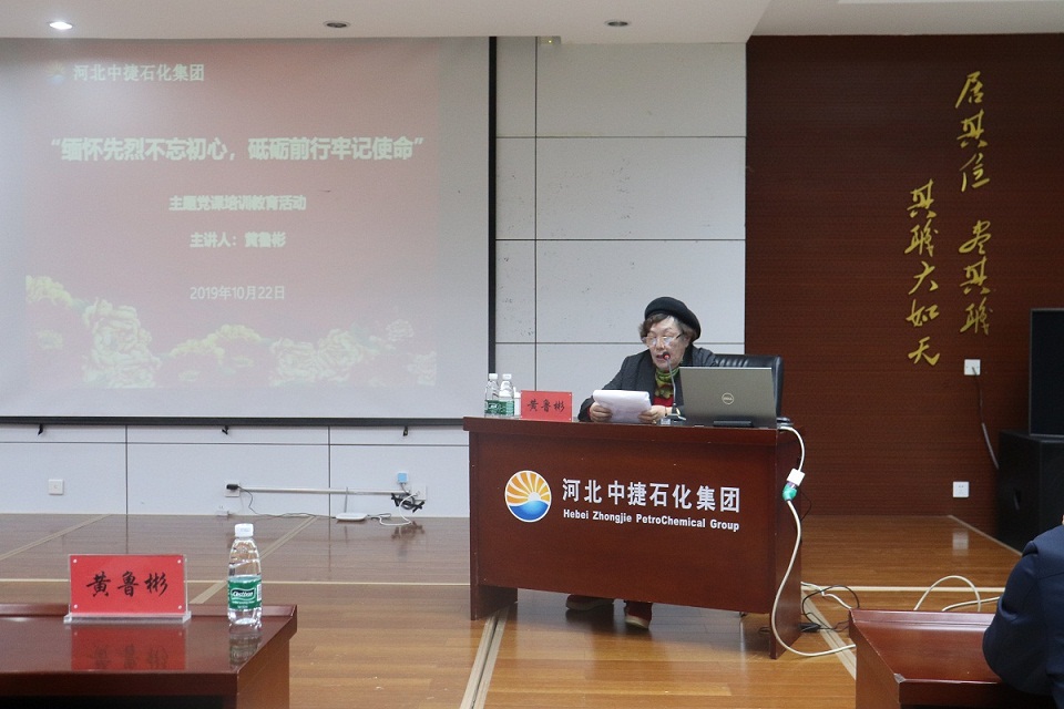 為緬懷革命先烈功績(jī),弘揚(yáng)革命傳統(tǒng)精神,激發(fā)廣大黨員干部愛(ài)國(guó)主義、集體主義精神和社會(huì)主義道德情操風(fēng)尚,培育和踐行社會(huì)主義核心價(jià)值觀,增強(qiáng)廣大黨員干部干事創(chuàng)業(yè)的向心力和凝聚力,10月22日,集團(tuán)黨委在科研樓六樓會(huì)議室組織開(kāi)展2019年“緬懷先烈不忘初心,砥礪前行牢記使命” 主題黨課培訓(xùn)教育活動(dòng),特邀抗戰(zhàn)英雄黃驊之女黃魯彬女士為大家授課,集團(tuán)公司總經(jīng)理喬樹(shù)華,黨委副書(shū)記朱振江、黨支部委員,黨建共建單位中海石油中捷石化有限公司黨員代表、集團(tuán)各單位黨支部書(shū)記、工會(huì)主席、黨員代表、黨務(wù)工作者共計(jì)70余人參加活動(dòng),中捷產(chǎn)業(yè)園區(qū)黨群工作部孟輝部長(zhǎng)、組宣部黨員代表出席了本次活動(dòng)。