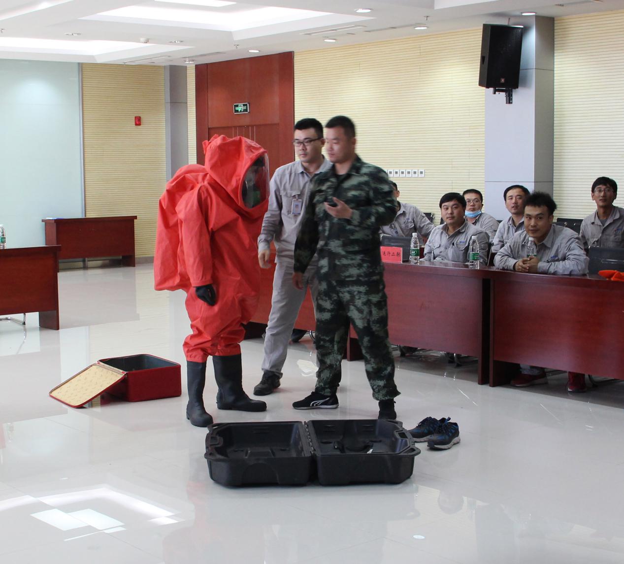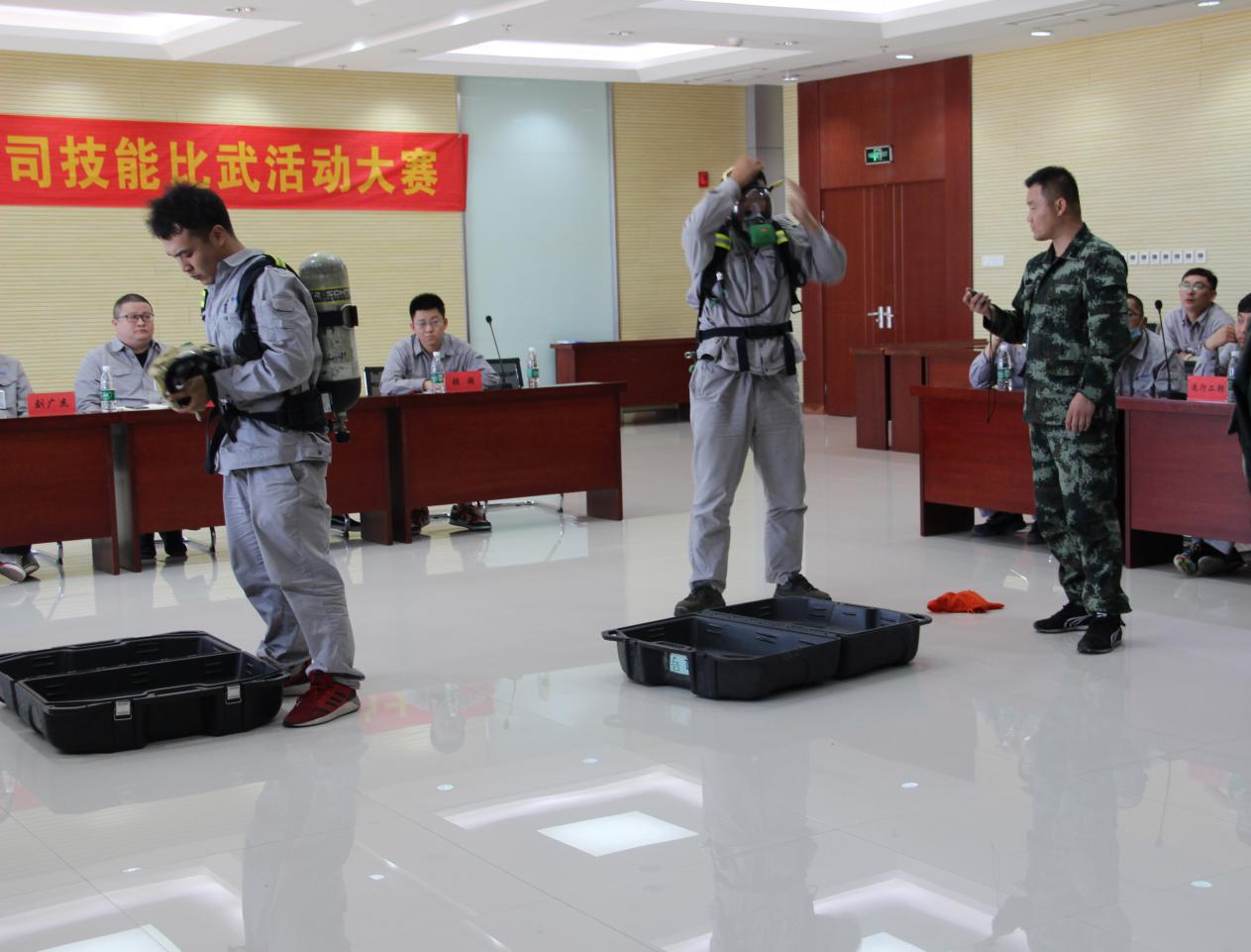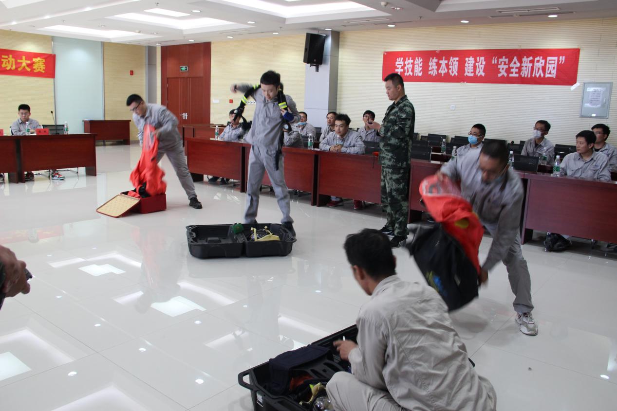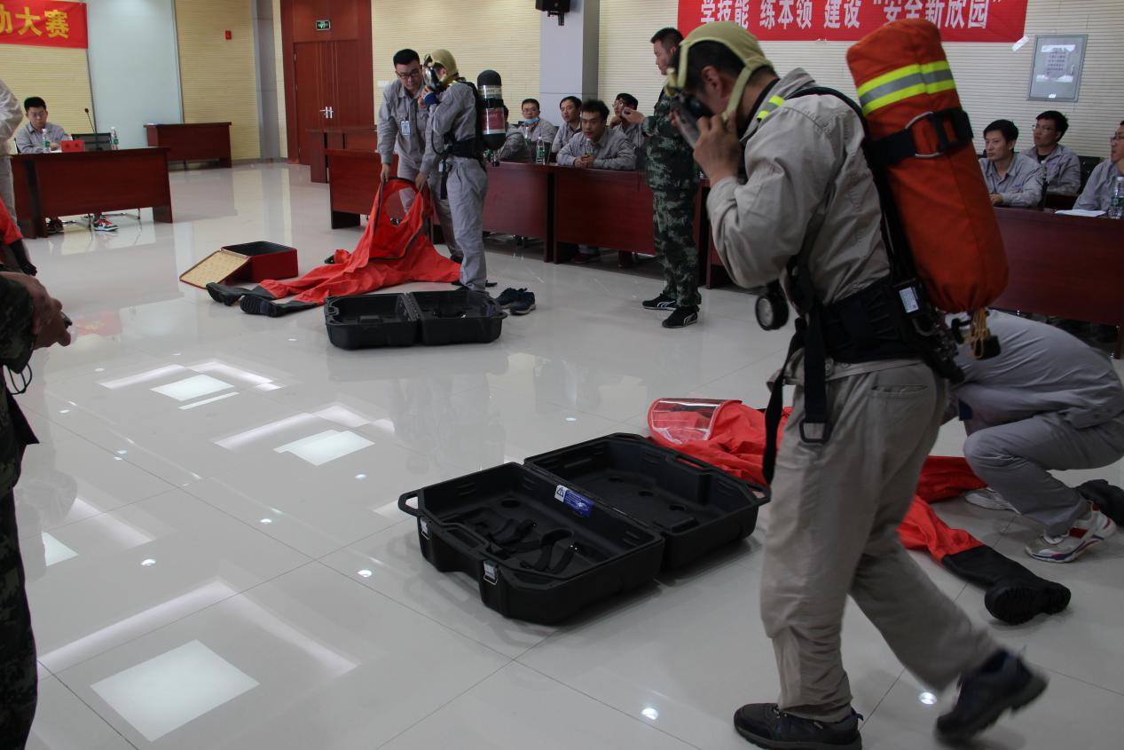 本次比賽分為“正壓式空氣呼吸器佩戴、防化服穿戴、安全知識問答”三個項目。在主持人發(fā)出“開始”口令后,選手們個個奮勇爭先,都拿出了自己的看家本領,展現精湛的“武技”,將活動氛圍推向高潮。經過緊張激烈的角逐,最終運行二部張賽以18秒03的成績獲得正壓式空氣呼吸器佩戴項目的冠軍,運行一部王圣濤、馬帥以35秒71的優(yōu)異成績奪得防化服穿戴項目的冠軍。