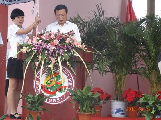 2012年9月2日上午10點,秋雨淅瀝,彩帶飄飄。黃驊中學在眾人翹盼中,迎來了她60歲的生日慶典,來自社會各界的校友齊聚一堂。慶典會上,集團公司總經(jīng)理于國臣代表集團公司董事長王振華,以及捐資助教的企業(yè)界同仁發(fā)言。發(fā)言中,于總既表達了中捷石化對黃驊中學的深切關(guān)注和支持,又表達了對黃驊中學60年華誕的祝福,以及對歷屆教師春風化雨的敬意。