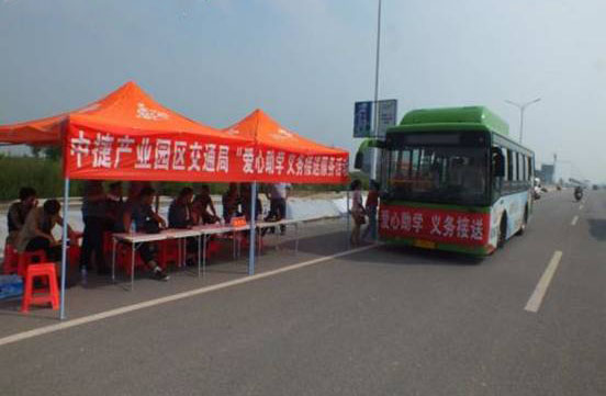 此次活動(dòng)我公司共出動(dòng)公交車(chē)2輛,出租車(chē)20輛,并且有運(yùn)政、路政共10名執(zhí)法人員參加,公交車(chē)和出租車(chē)的LED屏上顯示著醒目的“愛(ài)心助學(xué),義務(wù)接送”信息,并在黃驊汽車(chē)站設(shè)立了專(zhuān)門(mén)的服務(wù)臺(tái)和工作人員,引導(dǎo)遠(yuǎn)道而來(lái)的家長(zhǎng)和新生免費(fèi)乘車(chē)。工作人員幫新生提行李、引路,及時(shí)將新生和家長(zhǎng)送到早已等候的班車(chē),然后一站式送達(dá)至學(xué)校。此次義務(wù)接送農(nóng)大新生入學(xué)活動(dòng),得到廣大新生和家長(zhǎng)們一致好評(píng)。