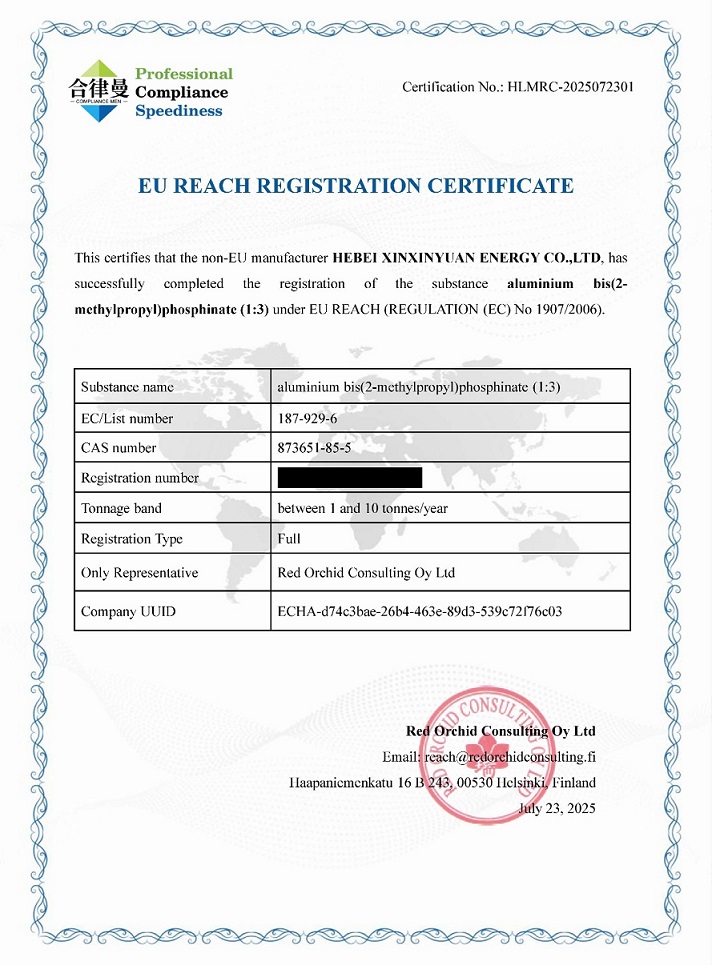 此次二異丁基次磷酸鋁產(chǎn)品REACH領頭注冊,不僅標志著新欣園公司成為全球首家獲得該產(chǎn)品歐盟市場準入資格的企業(yè),更意味著向歐盟官方提交的新一代無鹵磷系阻燃劑的健康環(huán)保測試數(shù)據(jù)得到全部認可,充分驗證了該產(chǎn)品在性能指標、安全規(guī)范及環(huán)境友好性方面全面達到國際頂尖水準的核心競爭力,彰顯了企業(yè)在綠色材料創(chuàng)新與標準化建設方面的行業(yè)領導地位,顯著增強了新欣園公司在高端應用市場的競爭優(yōu)勢,為全球合作伙伴提供了技術可靠、品質(zhì)穩(wěn)定的材料解決方案。